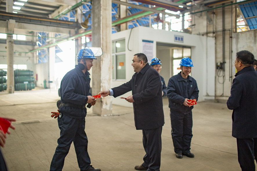 2月5日,集團(tuán)公司董事長(zhǎng)、黨委書(shū)記楊龍,黨委副書(shū)記戴鴻鳴等領(lǐng)導(dǎo)輕車(chē)簡(jiǎn)從,深入氯堿公司、氨綸公司、華茂公司、供電公司等基層單位,向春節(jié)期間堅(jiān)守在生產(chǎn)一線的廣大員工致以節(jié)日的問(wèn)候和祝福,并送去慰問(wèn)品。