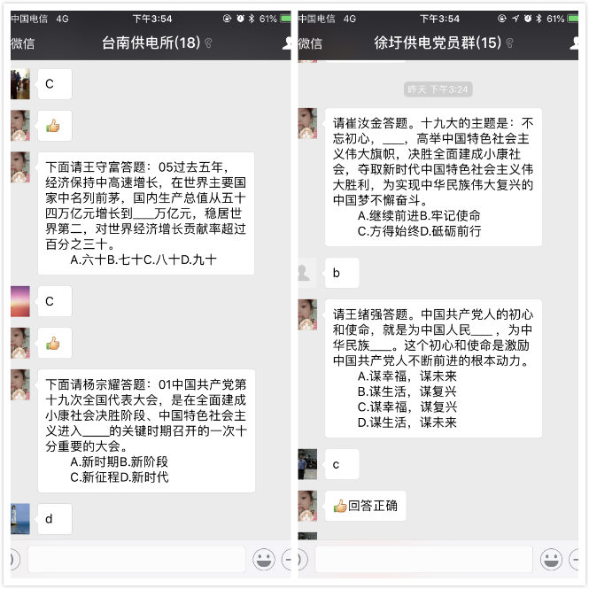 本次考試采用微信答題的方式,由黨群人員先在微信群里清點黨員人數(shù),隨后每人回答指定問題,確保測試范圍覆蓋全體黨員。微信考試的方式,解決了黨員學習時間上、空間上的難題,具有很大的便利性和可操作性。(電宣)