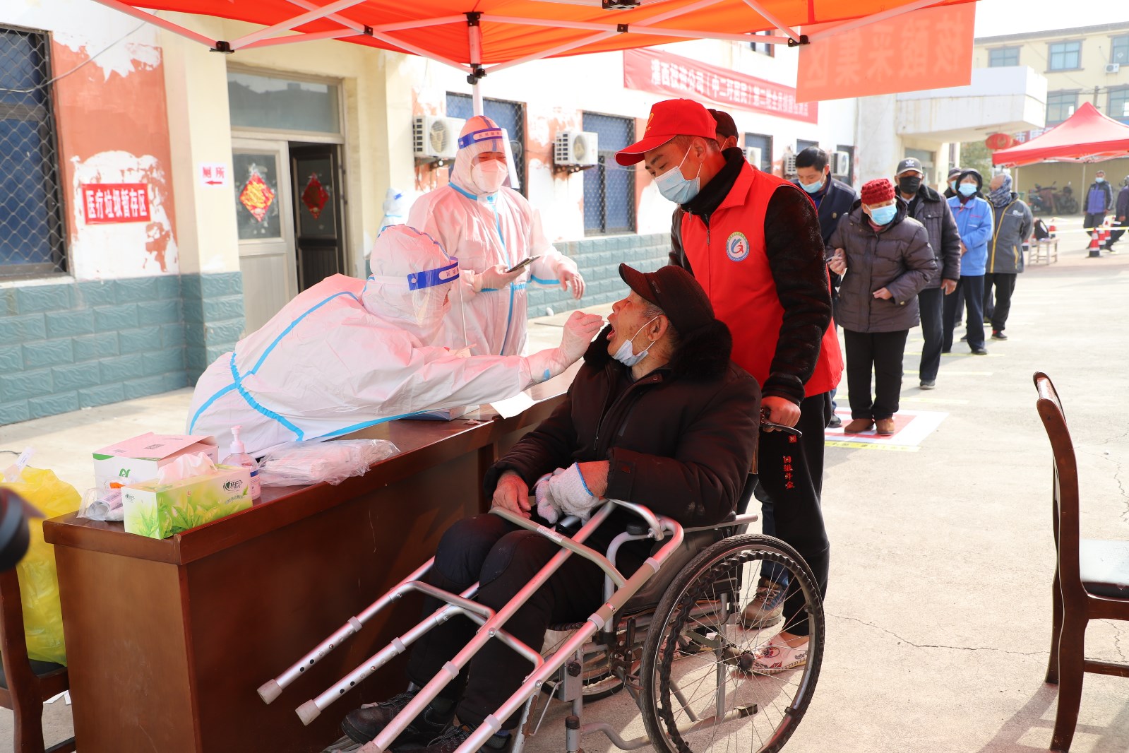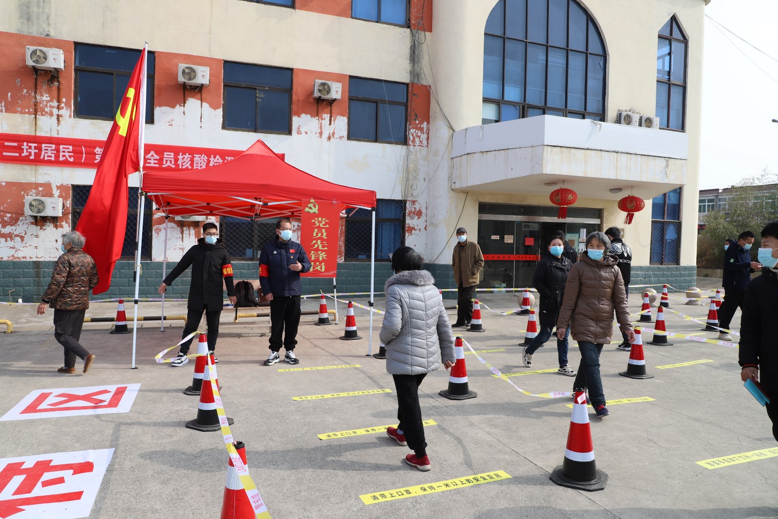 檢測(cè)現(xiàn)場(chǎng),各單位組織黨員先鋒隊(duì)成員、社區(qū)志愿者不斷優(yōu)化現(xiàn)場(chǎng)服務(wù),提醒居民群眾提前出示“蘇康碼”,有序排隊(duì),讓等待時(shí)間更短一點(diǎn)、人員距離更遠(yuǎn)一點(diǎn)、個(gè)人防護(hù)更好一點(diǎn)。另一方面,灌西檢測(cè)點(diǎn)開(kāi)設(shè)老者、孕婦、兒童綠色通道,減少這部分人群排隊(duì)等候的時(shí)間,同時(shí)安排志愿者攙扶、幫助不會(huì)使用智能手機(jī)的老年人,確保他們順利完成核酸檢測(cè)。