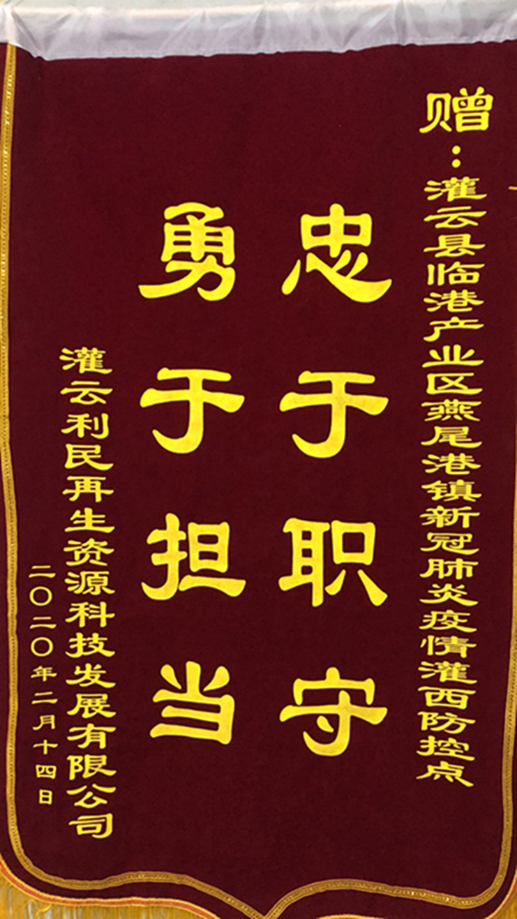 “非常感謝你們對我們?nèi)夜镜氖刈o(hù),為我們廣大職工筑牢了一道防疫情的銅墻鐵壁,你們辛苦了!”近日,連云港臨海新材、灌云利民再生資源、江蘇沙英喜三家公司分別為新冠肺炎疫情灌西防控點(diǎn)值守人員送來三面錦旗,感謝灌西投資公司值守人員在疫情期間為疫情防控工作作出的貢獻(xiàn)。