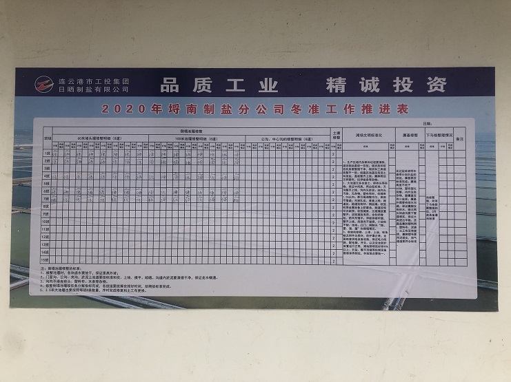 為更好落實(shí)“冬準(zhǔn)”大會(huì)會(huì)議精神,11月17日上午,埒南制鹽公司制定冬準(zhǔn)工作推進(jìn)表,張貼在公司辦公區(qū)域墻面上,促進(jìn)冬準(zhǔn)工作有序開展。