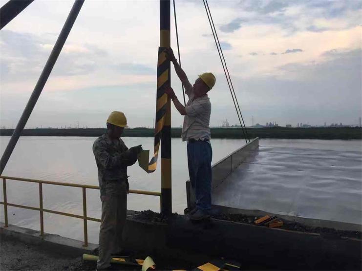 隨著碼頭裝卸業(yè)務(wù)愈加的繁忙,宵洋物流公司全體員工也都沉浸在這樣的工作狀態(tài)中,為碼頭業(yè)務(wù)拓展舔磚加瓦。常言道“安全無小事”,宵洋碼頭在忙于日常業(yè)務(wù)開展的同時,也在不斷的完善和落實碼頭場地上的安全保護措施,圖中為碼頭工人正在為場地內(nèi)的防護欄桿等貼上安全防護條。(宵洋張寶同)