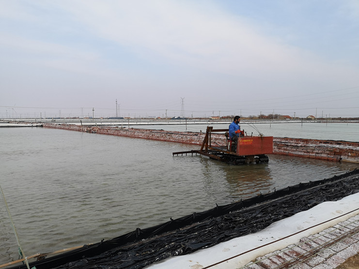 破碴勤、破碴透,才能保證原鹽生產(chǎn)的旺產(chǎn)增收。進入2月下旬,雖然受新冠肺炎疫情影響,相關(guān)工作較往年延遲,但新河制鹽分公司科學組織,嚴密安排,根據(jù)春季扒鹽節(jié)奏,合理調(diào)配破碴機械,率先啟動原鹽破碴工作。在十班破茬碴現(xiàn)場,班組結(jié)晶池內(nèi)熱火朝天,只見一臺臺破碴機快速來回穿梭,正在對擬春扒格塊進行機械破碴。勞模創(chuàng)新工作室成員、班長匡洪忠查看破碴的鹽池板后,臉上露出滿意的微笑,他說:“通過近幾年的小改小革,現(xiàn)在機械破碴格塊只要一個小時就全部到位,而且質(zhì)量比人工破碴好,大大地減輕了職工勞動負荷。”