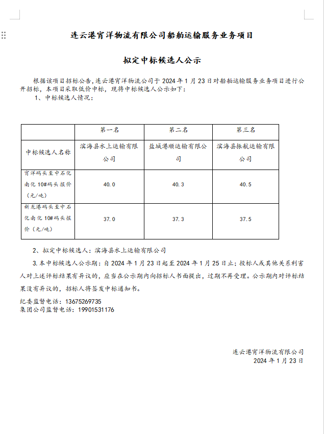 連云港宵洋物流有限公司船舶運(yùn)輸服務(wù)業(yè)務(wù)項(xiàng)目擬定中標(biāo)候選人公示