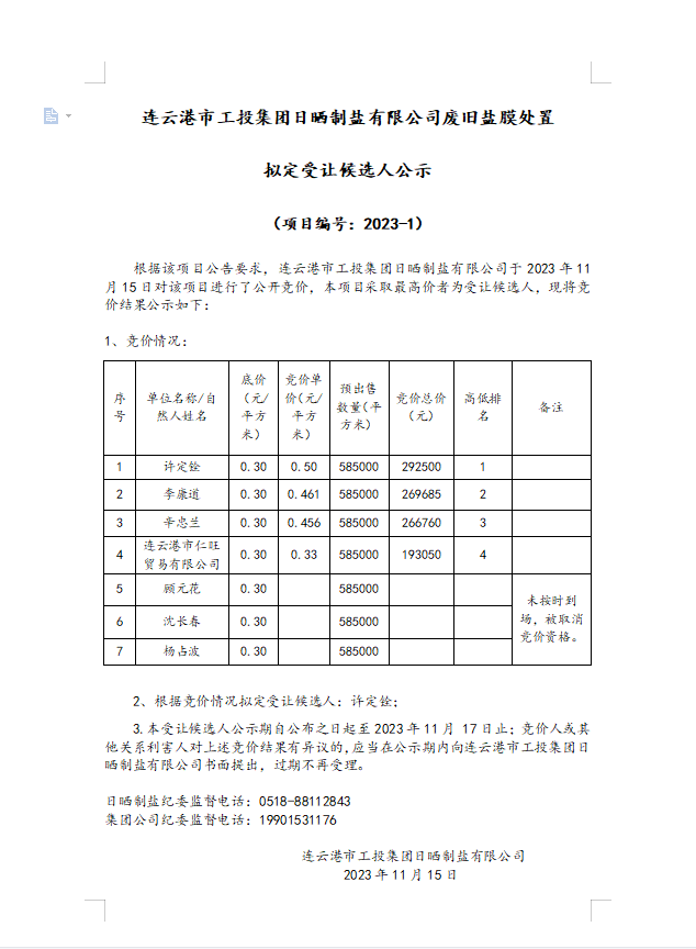 連云港市工投集團(tuán)日曬制鹽有限公司廢舊鹽膜處置擬定受讓候選人公示