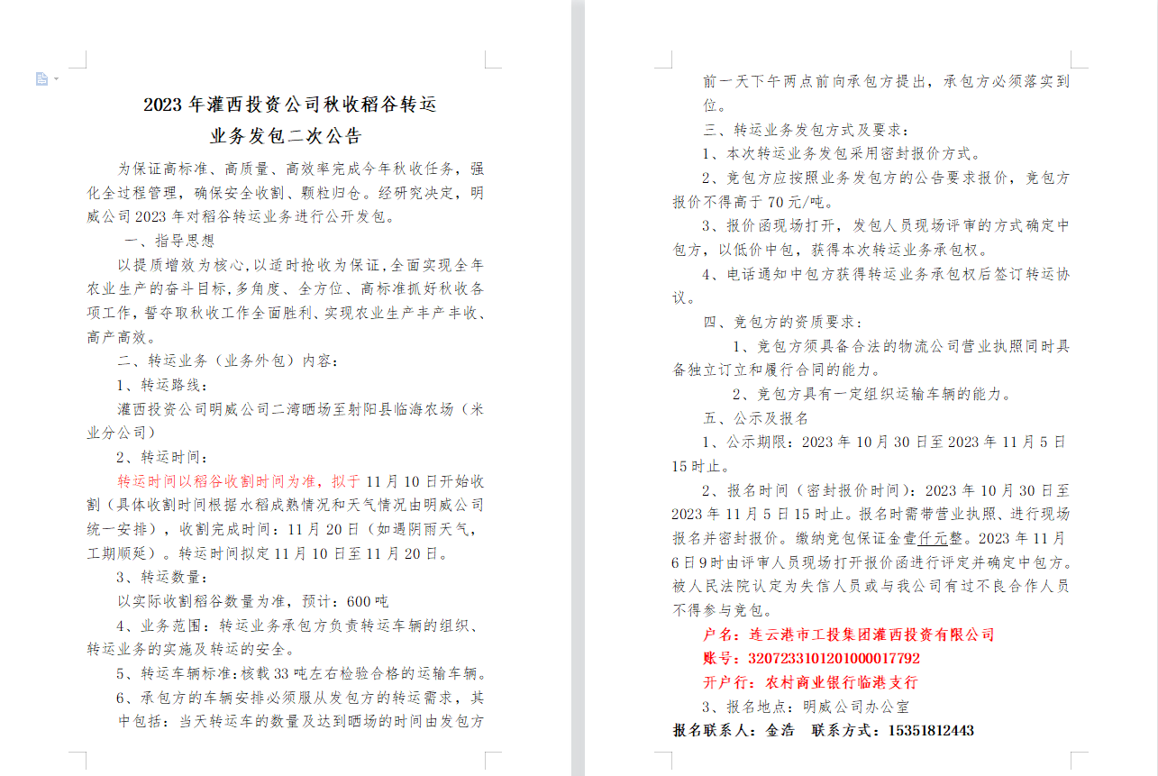 2023年灌西投資公司秋收稻谷轉(zhuǎn)運 業(yè)務發(fā)包二次公告