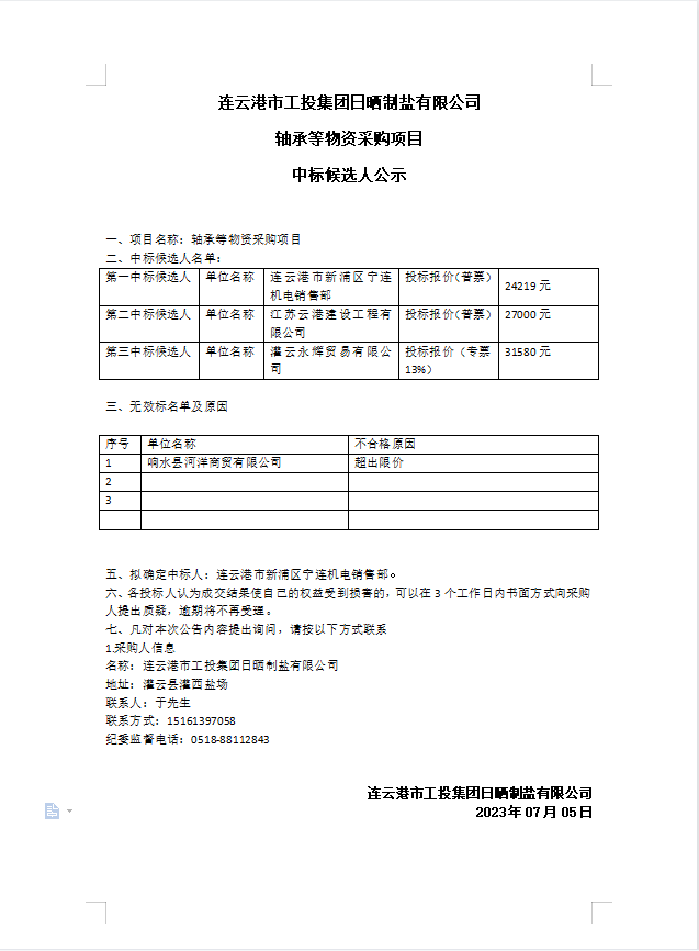 連云港市工投集團(tuán)日曬制鹽有限公司軸承等物資采購項(xiàng)目中標(biāo)候選人公示