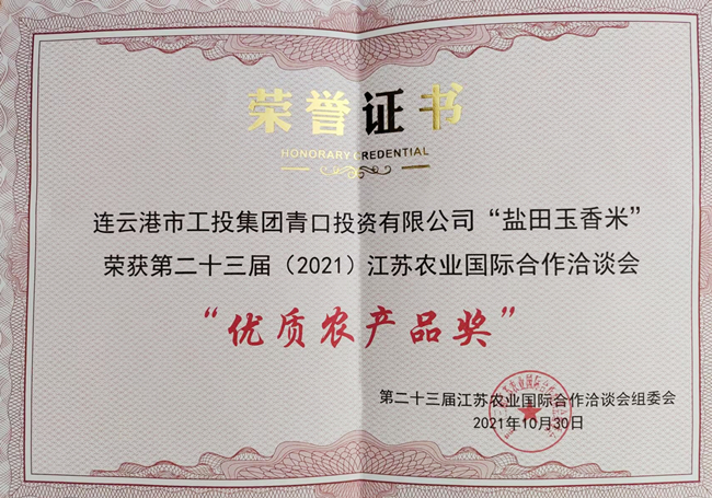 農(nóng)洽會上,“鹽田玉”大米憑借口感軟糯、營養(yǎng)豐富的口碑優(yōu)勢,再次得到大會和參展商的好評,并在眾多農(nóng)產(chǎn)品中脫穎而出,榮獲第二十三屆江蘇農(nóng)業(yè)國際合作洽談會“優(yōu)質(zhì)農(nóng)產(chǎn)品獎”。