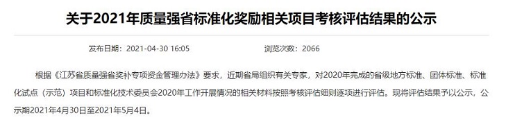 網(wǎng)址鏈接:江蘇省市場監(jiān)督管理局 綜合通知 關(guān)于2021年質(zhì)量強(qiáng)省標(biāo)準(zhǔn)化獎(jiǎng)勵(lì)相關(guān)項(xiàng)目考核評(píng)估結(jié)果的公示 (jiangsu.gov.cn)
