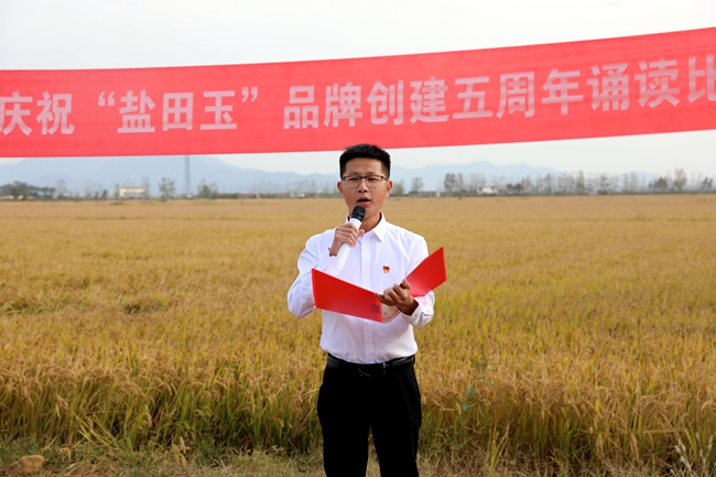 ? ?金秋十月,稻浪播香,又到一年豐收季。為慶祝“鹽田玉”品牌創(chuàng)建五周年,營造企業(yè)文化氛圍,展現(xiàn)職工群眾健康向上的精神風(fēng)貌,10月25日下午,投資公司于萬畝稻田間舉行慶祝“鹽田玉”品牌創(chuàng)建五周年誦讀比賽。公司黨委委員、副總經(jīng)理周緒祥,各單位黨政工負責(zé)人、機關(guān)全體管理人員,大新農(nóng)場條田工,米業(yè)營銷中心生產(chǎn)銷售團隊參加活動。