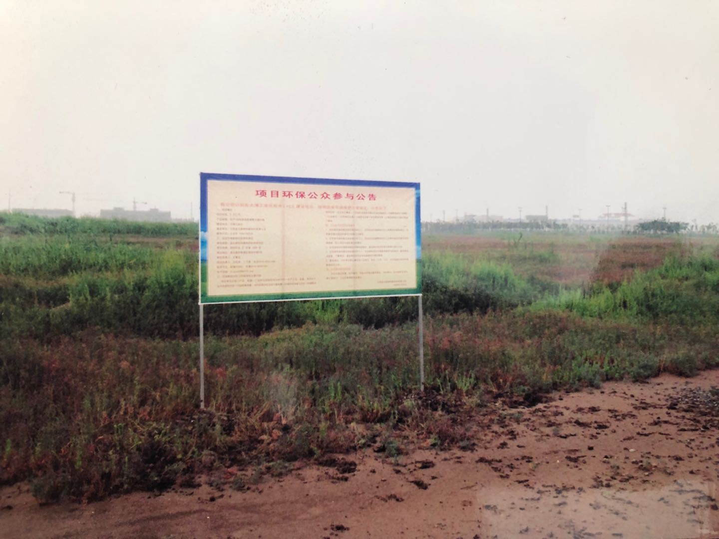 這是神特公司籌建時期的環(huán)評現(xiàn)場公示照片,是20088月底拍攝的。照片的重點(diǎn)部分是一個大牌子——項目環(huán)保公眾參與公告的牌子,位置大約在現(xiàn)在一期傳達(dá)室附近。做這樣的牌子是當(dāng)時環(huán)評的一個環(huán)節(jié),必須在建設(shè)場地進(jìn)行兩次公告,征求相關(guān)環(huán)境利益方的訴求。牌子的遠(yuǎn)方隱隱約約看見有些工廠和電力桿塔,牌子附近生長著茂密的堿蒿,一團(tuán)團(tuán)一簇簇,忽高忽低,可以看出地面是很不平整的。當(dāng)年豎牌子的時候,是雨后不久,地面較為泥濘,建設(shè)用地及周邊環(huán)境多多少少透射出一種蒼涼的感覺。