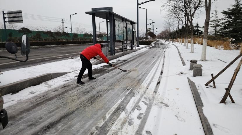 “融雪劑拋灑的時(shí)候要均勻拋灑,不要成團(tuán)堆積,這樣不僅融雪的效果不好,還會(huì)浪費(fèi)物資。”預(yù)備黨員武新忠一邊說(shuō)著,一邊示范著給其他隊(duì)員。哪里的積雪最厚,哪里就有他們揮鍬鏟雪的身影。在融雪劑不能及時(shí)送達(dá)的情況下,他們就使用人工除雪的方式,不斷檔、不離線、不缺位的清除路面積雪,保證路面不出現(xiàn)積雪狀況。為堅(jiān)決完成上級(jí)“雪停路凈”的掃雪除冰任務(wù),他們不畏嚴(yán)寒,冒著風(fēng)雨冰雪,晝夜不停,連續(xù)三天奮戰(zhàn)在掃雪的一線!以雪為令,雪不停,掃雪不止,一直堅(jiān)守在掃雪工作中,有效清除了區(qū)域內(nèi)的積雪,確保了交通道路的安全暢行。