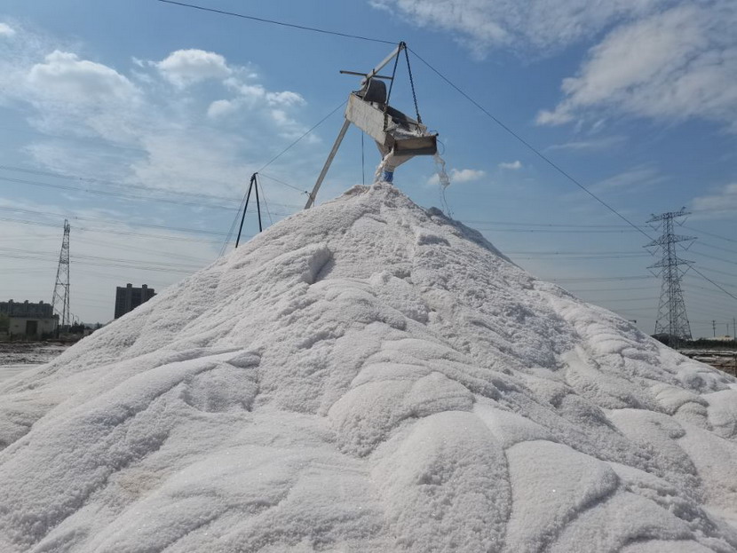 第一片180公畝的曬鹽池已經(jīng)收鹽完畢,工人師傅們嫻熟有序用塑布對(duì)鹽廩進(jìn)行覆蓋,預(yù)防雨水造成鹽斤淌化。