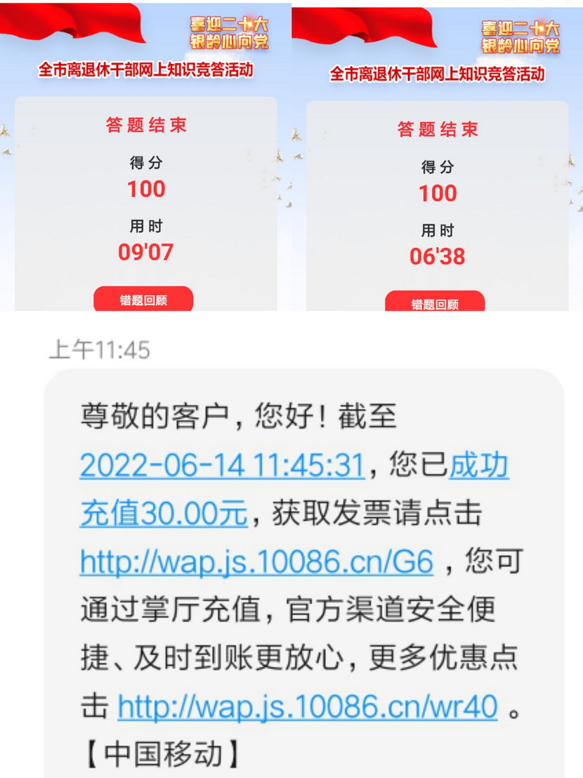 猴嘴辦事處對此次答題活動高度重視,動員猴嘴辦事處人員積極參與答題活動,并引導鼓勵離休老干部積極參加答題活動。經(jīng)過七天的連續(xù)網(wǎng)上奮戰(zhàn)答題,獲獎評選結(jié)果于6月13日揭曉,猴嘴辦事處張克娟同志喜進第一周獲獎人員名單,并且已收到了30元的話費充值獎勵。獲獎本人表示,將把此次競答獎勵轉(zhuǎn)化為學習的再生動力,再接再厲,以學促行,推動服務(wù)能力再提升。