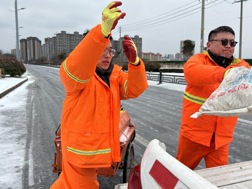 本次掃雪除冰共配備了3輛清掃車、2輛鏟車、1輛撒布機以及20余噸融雪劑,20余把推雪鏟、鐵鍬等清雪工具,采取“邊下邊除、邊除邊清、邊清邊運”的方式,根據道路積雪厚度和結冰情況,通過撒布融雪劑、除雪鏟推雪、人工配合等多措并舉,有效清理區(qū)內主干道積雪,做到“即下即掃、雪停路清”,保障群眾出行安全。此外,針對紅綠燈路口、馬路轉彎處、陡坡、橋面以及非機動車道等重要節(jié)點,環(huán)衛(wèi)分公司又出動了100余名工作人員點對點人工撒布融雪劑,共保障面積300余萬平方米。