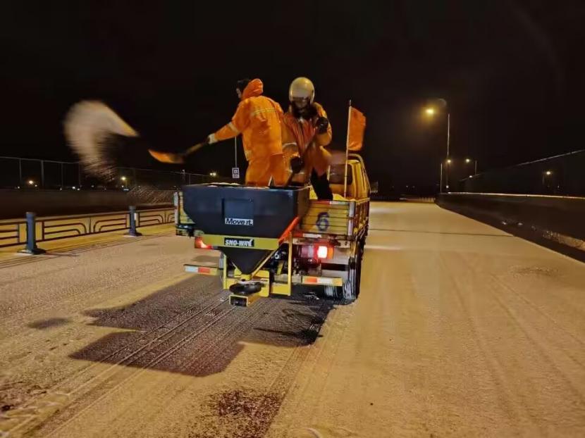 夜晚12點,在佟圩路馬山立交,孫玉虎在工程車上一邊拋撒融雪劑一邊指揮:“融雪劑一定要撒布均勻,適當擴大距離,避免浪費。”工程班金華、蘇志國、林軍、李林不停地在風雪中揮舞著鐵锨,絲毫顧不上被風雪擊打的面部疼痛。