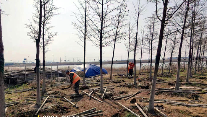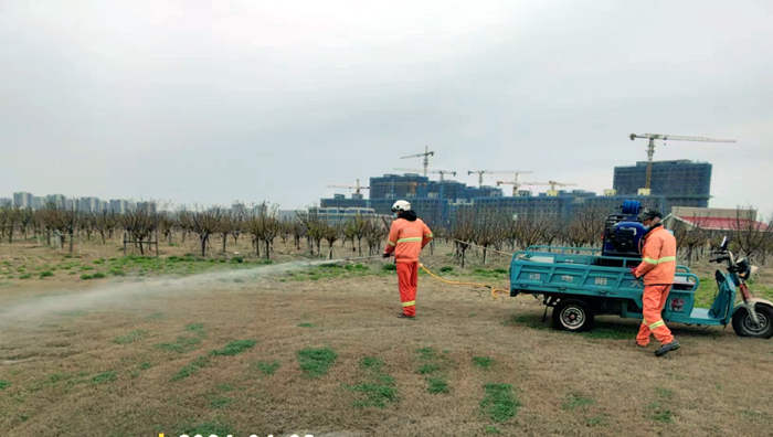 積極澆灌返青水。當(dāng)前,地溫回升快,苗木易萌芽,該班組采用“人工+機械”相結(jié)合的方式,全面啟動返青水集中澆灌工作,重點對園區(qū)喬木、果木、草坪等進(jìn)行全面灌溉,促進(jìn)苗木、草坪返青發(fā)芽。按照分種類、合理澆灌的原則,采取集中澆灌的方式最大限度減緩晝夜溫差對綠化植物的影響,入春后共澆水100余次,對落羽杉圓動力灌根2000棵,對大樹澆水1500棵,綠化澆水約30000平方米。