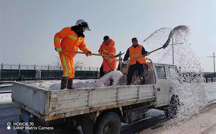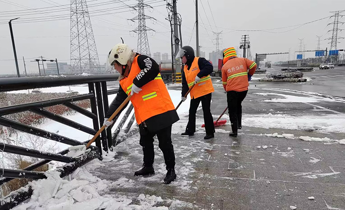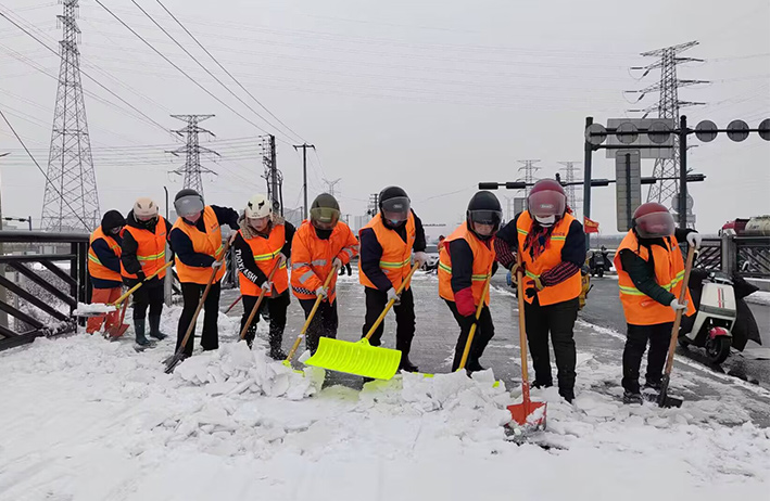 在白雪皚皚的雪地里,身穿橘黃工作服的保潔工人就是最美的點(diǎn)綴,他們頂著風(fēng)雪吹打臉頰,兩人一組、三人一對,配合默契,揮動手中鐵銑,用力拋灑融雪鹽斤80多噸,10余車。道路橋粱兩側(cè),人行輔道邊上,公司上下齊心協(xié)力,9名班長在公司統(tǒng)一調(diào)配下,帶領(lǐng)班組人員,人工清除大小橋梁兩側(cè)積雪30多座,人行輔道長達(dá)3000多米長,站臺、叉路口積雪100多處,為保障恢復(fù)雪后新城環(huán)境整潔而努力工作。大型清掃設(shè)備駕駛員全員齊上陣,安全行車裝運(yùn)融雪鹽斤里程達(dá)200多公里,工作時(shí)長10個(gè)多小時(shí),安全操作鋤雪機(jī)械清理張圩互通引橋,埒子口大橋等路段長達(dá)5000多米長,有力彰顯機(jī)械破冰、除雪強(qiáng)大功能。(楊波)
